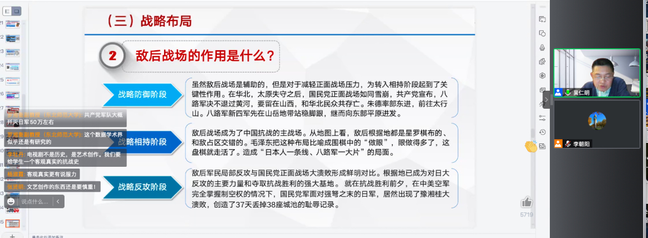 吴仁明教授围绕“为什么说中国共产党是中国人民抗日战争的中流砥柱”这一主题,从点题切入、主题解释、课堂总结、延伸阅读四个方面做了精彩的教学展示。