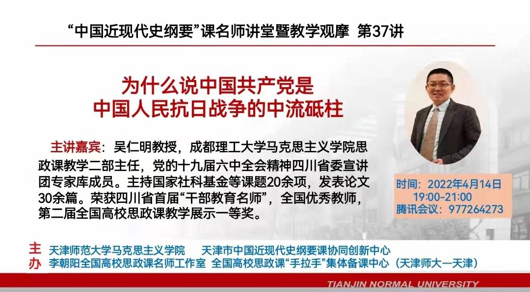 4月14日,天津师范大学马克思主义学院、李朝阳全国高校思政课名师工作室、全国高校思政课“手拉手”集体备课中心(天津师大—天津)、天津市中国近现代史纲要课协同创新中心等联合主办“中国近现代史纲要”课名师讲堂第37讲,邀请成都理工大学马克思主义学院思政课教学二部主任、全国优秀教师、四川省首届“干部教育名师”、第二届全国高校思政课教学展示一等奖获得者吴仁明教授主讲。校党委委员、马克思主义学院党总支书记、院长熊焱生和全体“纲要”课程教师通过线上方式参与学习。