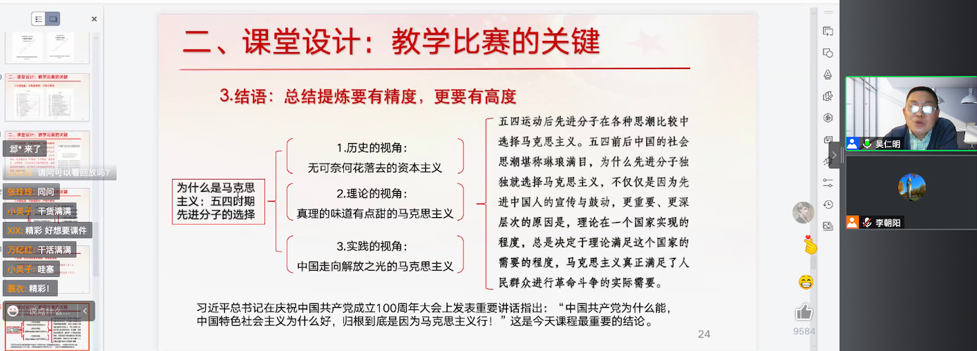 教学展示结束后,吴仁明教授就自己的教学经验和竞赛经验与线上参会教师进行了深入探讨。他表示,在教学比赛中,课堂内容是教学比赛的核心竞争力,应坚持“内容为王”,让思政课有高度、深度、长度与温度;在课堂设计方面,应具有针对性、新颖性与精炼性,内容选取应不脱离教材的同时不拘于教材,总结的提炼应有精度与高度;在语言表达上,应当培养语言表述的准确性、简洁性与概括性。