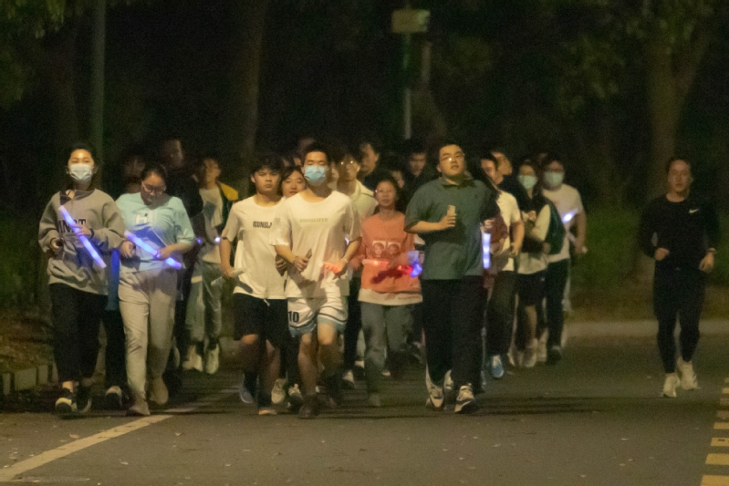 活动现场没有疫情的阴霾,全然洋溢着青春的活力!夜跑队伍分组分别在晚间七点、七点半和八点开始。开跑前,两校区工作人员沈彬、田沛原、顾恬、杨秋红等同学带领各组参跑者活动手腕、脚腕,作跑前热身运动。荧光夜跑正式开始,同学们在领跑志愿者的带领下按指定路线慢跑一圈,四名方阵管理员在旁跟跑,维持秩序,提醒路人。夜跑过程中,同学们聆听着欢愉的乐曲,打开手机灯光,手握荧光棒,无关快慢,无关里程,无关终点,在简单的摆臂和跨步中尽情享受跑步本身的乐趣。