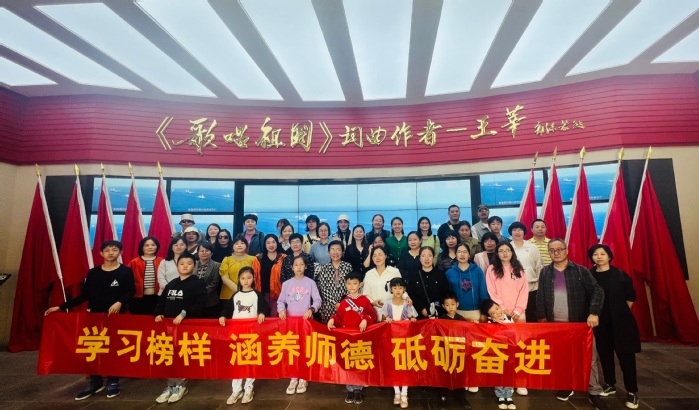 荡口古镇历史悠久、人文荟萃。踏着青石小路漫步其中,大家一起参观了我国近代科学的先行者、数学家、教育家、翻译家华蘅芳生平事迹陈列馆,《歌唱祖国》的作者王莘的故居,中国现代历史学家、思想家、教育家钱穆的旧居等。在王莘故居,老师们缓缓地踱步在伴有《歌唱祖国》音乐声的长廊中,通过欣赏王莘生前的笔书、乐曲和照片,感受到了王莘先生作品的艺术魅力,强烈的爱国主义情怀油然而生。大家一起在大厅合唱了“五星红旗迎风飘扬,胜利歌声多么响亮。歌唱我们亲爱的祖国,从今走向繁荣富强……”