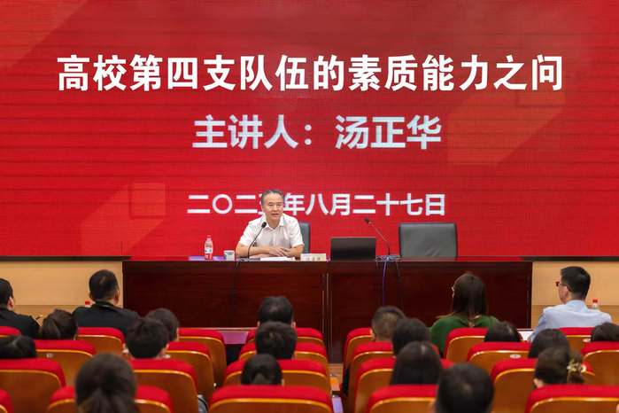 校党委书记汤正华以《高校第四支队伍的素质能力之问》为题,与辅导员进行深入交流。他分析了当前辅导员队伍存在的“四大困惑”和“四个不足”,聚焦“六大主业”,系统阐述了高校第四支队伍迈向卓越应具备的“七项素质”和“五大能力”。他的精彩报告不仅为辅导员职业发展指明了方向,也为加快提升我校学生工作水平提供了实践路径。