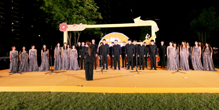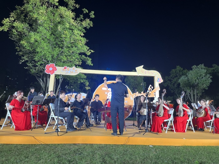 草坪音乐会是当晚亮点,师范学院音乐系师生携天华民乐团、星光艺术合唱团演出,带来民乐合奏《金蛇狂舞》、双簧管《天鹅湖》、合唱《舟中晓望》、古筝《乡韵》、独唱《爱永在》等多样节目,以高水平演出获居民一致好评,让大家在音乐中相遇,在旋律中共鸣。