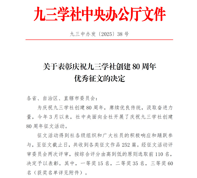今年3月起,九三学社中央委员会面向全社开展庆祝九三学社创建80周年征文活动。九三学社常州工学院委员会社员苗贵松的《长空万里,直下看山河——九三学社院士与小行星命名之中国故事》经选送入选社中央评选名单。