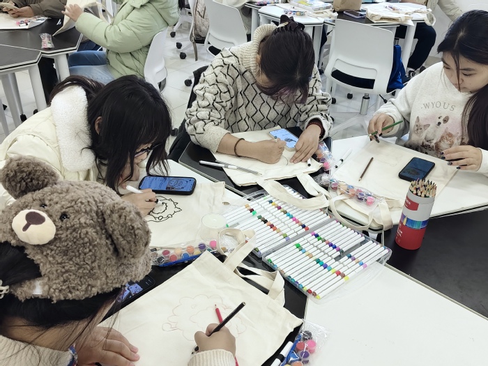 活动以“五育润心 沐光同行”心理健康教育要求为指引,将美育与心育结合。现场备好空白帆布包、颜料、画笔等材料,同学们以校园里的猫、蜗牛、喜鹊等生灵为灵感,把观察中的感动凝于笔端,专注创作萌趣动物形象与心灵故事。