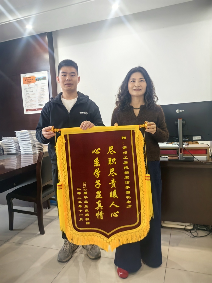 2025年12月2日,冬日暖阳洒满校园。这一天,刚考入东华大学硕士研究生的2022届校友张鹏专程从上海赶回母校,将一面写有“尽职尽责暖人心 心系学子显真情”的鲜红锦旗,郑重地送到档案馆李雪花老师手中。