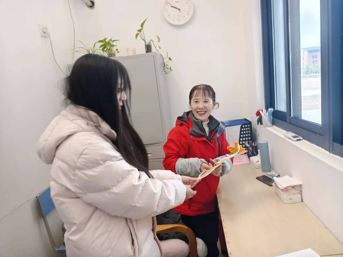 “指尖生花DIY”环节中,同学们领取扭扭棒工具,发挥巧思制作手工花,并搭配手写贺卡,将这份心意赠予学校女性职工,以温馨方式表达敬意。